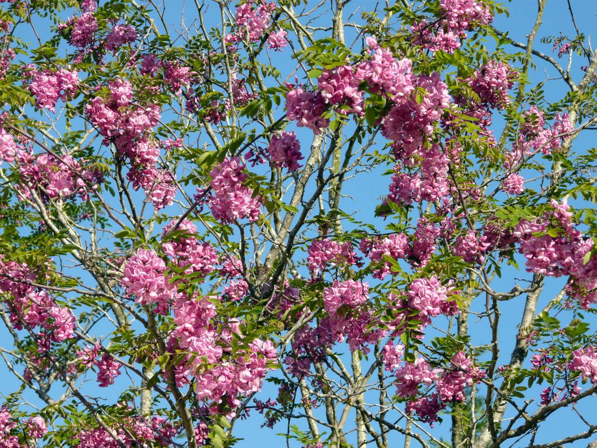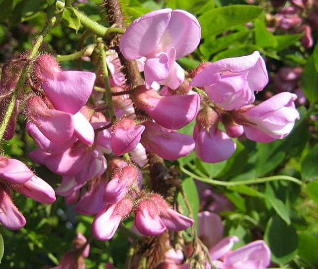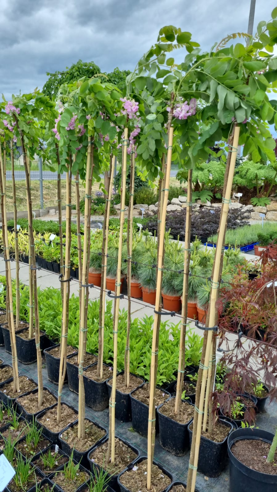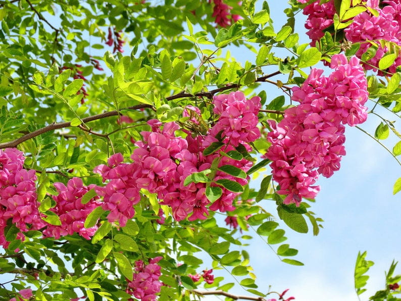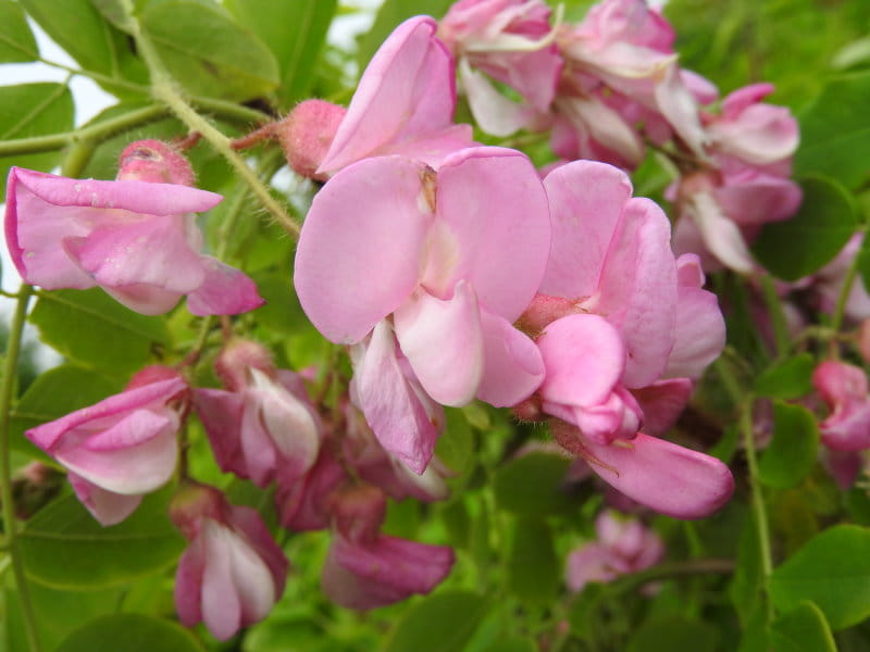 Robinia štetinatá je mimoriadne dekoratívna odroda agátu, najčastejšie ponúkaná v štepenom tvare na kmienku. Patrí medzi najpôsobivejšie kultivary vďaka veľkým, sýto ružovým kvetom – najväčším zo všetkých robínií pestovaných v záhradách. Dorastá do výšky približne 3–4 metre a vytvára kompaktnú, upravenú korunu, ktorá je ideálna aj do menších priestorov. Charakteristickým znakom sú výhony husté pokryté červenými štetinami, ktoré dávajú rastline nezameniteľný vzhľad. Kvety sa objavujú dvakrát ročne, na jar a koncom leta, a vytvárajú krátke, veľmi dekoratívne súkvetia. Hoci nevonia, ich farba pôsobí mimoriadne atraktívne.